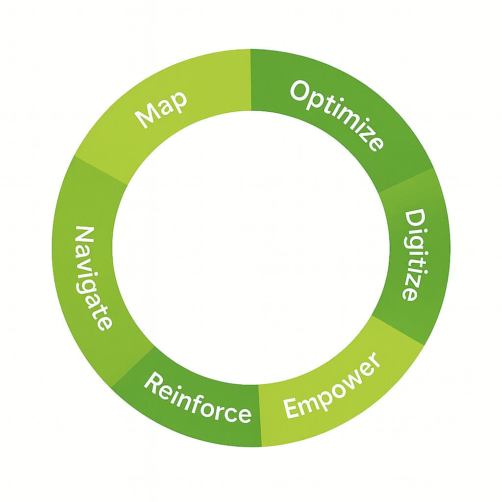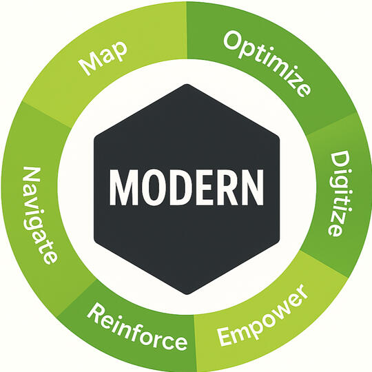 MODERN™ = Map, Optimize, Digitize, Empower, Reinforce, NavigateMODERN™ is a six-pillar framework for enterprise modernization. It’s designed to take an organization from “we know things aren’t working” to “we have a clear roadmap, modern systems, aligned teams, and sustainable governance.A framework I use when structure is needed.It is not a rigid system.